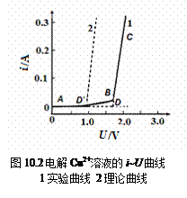 在电解时,能够使被电解物质在两电极上产生迅速、连续的电解反应,所需的最低外加电压称为分解电压。图10.2中D点所示。上述电解过程中,电解发生后,电解产物铜和氧气分别沉积和被吸附在阴极和阳极上,形成铜电极和氧电极构成的原电池,该原电池的电动势与外加电压方向相反,它阻止电解作用的进行,被称为电解池的反电动势。只有当外加电压达到能克服此电解池的反电动势时,电解才能继续进行,i―U曲线上的电解电流才能随外加电压的增大显著上升。各种电解质的分解电压是不同的,对于电化学可逆过程,理论上的的分解电压在数值上等于电解池的反电动势。