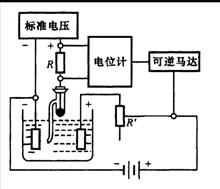 在控制阴极电位电解过程中,要随时测定阴极电位,随时调节电压以控制阴极电位为一恒定值。图10.6是机械式自动控制阴极电位电解仪。甘汞电极和阴极组成的原电池与一个电位计反向串联。调节电位计的输出电压使之与设定的阴极电位(相对于甘汞电极)相等。例如,如果要把阴极电位控制在-0.35 V,则电位计的输出电压就调节到0.35 V。在电解过程中,只要阴极电位保持在-0.35 V,标准电阻R就没有电流通过,当阴极电位偏离所需的电位值时,就有电流通过电阻R,R上的电压经放大器放大后,驱动可逆马达调节R′,控制电解池的外加电压,使阴极电位回到应该控制的数值(-0.35 V),这样就实现了阴极电位的自动控制。