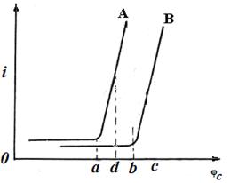溶液中存在两种以上可沉积的金属离子时,进行电解就应考虑干扰和分离问题。如果两种金属离子的还原电位相差较大,可用控制阴极电位电解法使两种金属分离。例如,溶液中有A、B两种金属离子,其电解电流与阴极电位(i–φc)曲线如图10.7所示。图中a、b两点分别为A、B两种金属离子的析出电位,d、c两点分别为A、B两种金属离子析出完全时电极的平衡电位(一般认为,当某离子浓度降低105倍或降到1×10-6 mol·L-1时,就已定量析出这种离子,可认为达到分离和分析的要求)。可见,只要将阴极电位控制在db之间进行电解,就可以使A离子定量析出,而B离子仍然保留在溶液中,从而实现A、B离子的分离和A离子的测定。待A离子测定完毕后,再将阴极电位控制在c点进行电解,就可以实现B离子的测定。