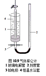 ① 气体库仑计 它的结构如图10.9所示。它是由一个带有旋塞和两个铂电极的玻璃电解管与一支刻度管以橡皮管相连接。电解管外为一恒温水浴套,管内装有0.5 mol·L-1 K2SO4溶液。使用时将库仑计与电解池串联,当电流通过刻度管中的电解质时,在铂阳极和铂阴极上分别析出O2和H2。两种气体都进入刻度管内,从电解前后刻度管中的液面差就可以读出氢氧混合气体的体积。在