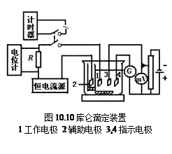 库仑滴定法装置如图10.10所示,主要由电解系统和终点指示系统两部分组成。电解系统是由电解池、计时器和恒电流电源组成。指示系统可用化学指示剂法或电化学的方法。