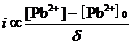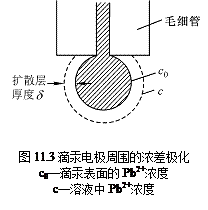 继续增加外加电压,滴汞电极的电位较Pb2+的析出电位更负,滴汞电极表面的Pb2+迅速还原,电流急剧增加,即图11.2中的BD段。由于Pb2+在电极上的还原,滴汞电极表面的Pb2+浓度低于溶液主体的Pb2+浓度,产生所谓“浓差极化”,于是Pb2+就要从主体溶液向电极表面扩散,扩散到电极表面的Pb2+立即在电极表面还原,产生持续不断的电流,这种电流的大小由Pb2+扩散到电极表面的扩散速度决定,所以称为扩散电流(i)。由于Pb2+在电极上的还原,在电极表面附近存在离子浓度变化的液层,该液层称为扩散层(图11.3),其厚度约为