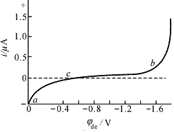 应用图11.5的装置电解已除氧的0.1 mol·L-l KCl溶液,由此得到如图11.6的电容电流曲线。由图11.6可见,由a到b是残余电流,当溶液中没有可以在电极上起反应的杂质时,残余电流全部是电容电流。b以上是K+的还原电流。
