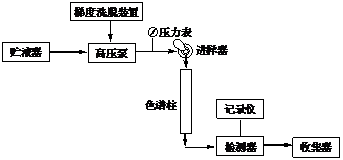 高效液相色谱工作过程为:高压泵将贮液器中的流动相经过进样器带入色谱柱,当注入欲分离的样品时,流动相将样品一并带入色谱柱进行分离,然后依先后顺序进入检测器,记录仪将检测器输出的信号记录下来,即得到色谱图,流动相和样品从色谱仪出口流出被馏分收集器收集得到。