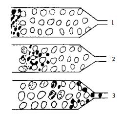 排阻色谱法采用具有一定孔径分布的多孔性情性物质作为柱填料。柱填料与流动相平衡后,孔内充满着流动相。当样品溶液随流动相流过色谱柱时,比填料最大孔径还大的样品分子不能扩散进入填料孔内,完全被排阻在填料之外,随流动相直接流出色谱柱,比填料最小孔径还小的分子可以扩散进入填料的所有孔内,最后流出色谱柱,中等大小的分子可以进入填料的部分孔内,流出色谱柱的顺序居中。分离过程模型见图15.20。