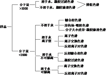 高效液相色谱中几种分离方法都有各自的适用范围,具体选用哪一种分离方法比较合适这决定于样品的性质,如分子量范围、溶解度、官能团类型和其数量等,由红外、紫外、核磁等数据可获得样品的有关信息,有助于选择分离方式。若组分分子量大于2000,应采用排阻色谱法,若样品溶于水,则以水溶液为流动相,若样品溶于有机溶剂,则相应的溶剂可用作流动相;若分子量小于2000,首先应确定样品是否溶于水,若样品溶于水,可考虑用离子交换色谱法、离子色谱法或反相键合相色谱;若样品不溶于水,但溶于有机溶剂,可考虑用键合相色谱或吸附色谱,若样品溶于中等极性或强极性溶剂,应选用非极性或弱极性固定相,若溶于非极性溶剂,则应采用极性固定相。分离方式选择的一般原则如下: