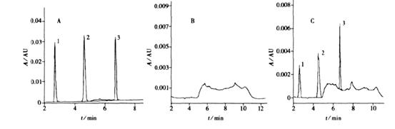 分析结果:利用高效液相色谱法同时测定土壤中多菌灵、吡虫啉和甲基托布津残留利用C18柱分离,紫外检测器检测,在7 min内实现了3种农药的同时分离测定。3种农药的平均回收率为87%、97%和92%,相对标准偏差为9.8%、8.1%和11.0%。色谱图见图15.22。