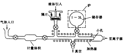 通过可拆卸式的试样管将少量(10~100 μg)固体和液体试样引人试样储存器中,由于进样系统的低压强及储存器的加热装置,使试样保持气态。实际上试样最好在操作温度下具有0. 13 ~ 1.3 Pa的蒸气压。由于进样系统的压强比离子源的压强要大,样品离子可以通过分子漏隙(通常是带有一个小针孔的玻璃或金属膜)以分子流的形式渗透进高真空的离子源中。