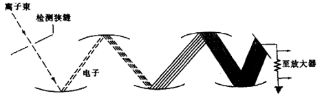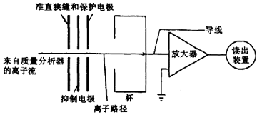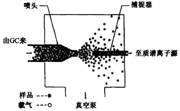 在分子分离器中,从气相色谱来的载气及样品离子经一小孔加速喷射入喷射腔中,具有较大质量的样品分子将在惯性作用下继续直线运动而进人捕捉器中,载气(通常为氦气)由于质量较小扩散速率较快,容易被真空泵抽走。必要时使用多次喷射,经分子分离器后,50%以上的样品被浓缩并进人离子源,而压力则由1.0×105 Pa降至1.3×10-2 Pa。