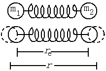 如上所述,双原子分子运动可近似地看成一些用弹簧连接着的小球的运动。以经典力学的方法可把两个质量为m1和m2的原子看成钢体小球,连接两原子的化学键设想成无质量的弹簧,弹簧的长度r就是分子化学键的长度。则它们之间的伸缩振动可以近似的看成沿轴线方向的简谐振动。因此可以把双原子分子称为谐振子。由经典力学(虎克定律)可导出该体系的基本振动频率计算公式: