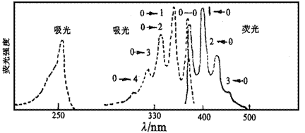 (3) 与激发光谱大致成镜像对称关系 一般情况下,基态和第一电子激发单重态中振动能级的分布情况是相似的,所以荧光光谱同激发光谱的第一谱带大致成镜像对称。如图5.3所示。