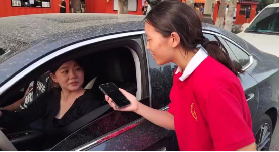 图为实践团成员对私家车驾驶司机进行交通安全采访