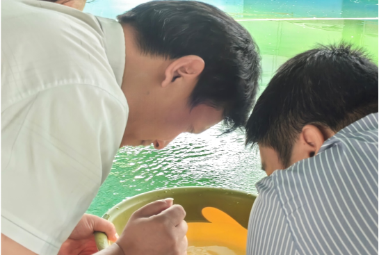 图为魏杰副教授、刘广峰专家在观察鱼苗