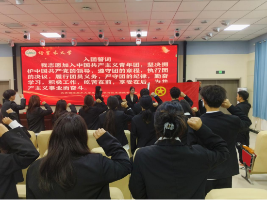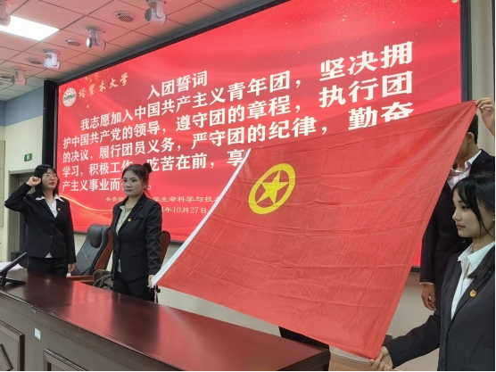 在领誓人周振祥的带领下,新团员面向团旗,右手握拳进行入团宣誓。