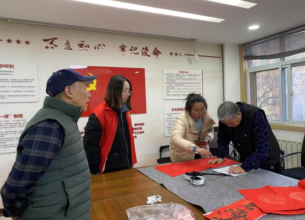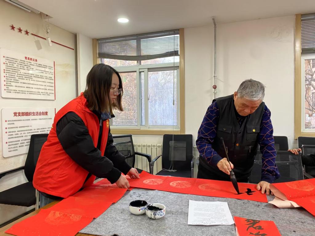活动分为室内书法展示与室外送祝福两大主题。“书法家”们在室内挥毫泼墨,创作寓意吉祥的春联;老员工志愿者在一旁协助研磨、整理作品,确保每一副春联都能完美呈现。在室外送祝福区,志愿者则协助搬运物资、准备材料,有序引导居民领取春联,并耐心解答居民疑问,介绍春联文化内涵。