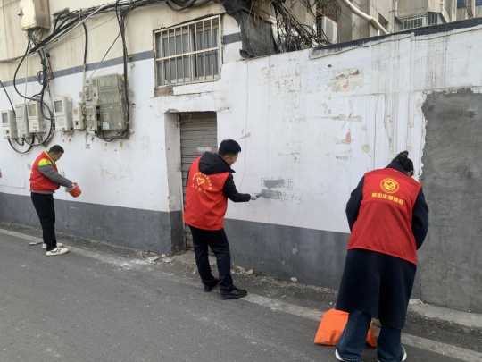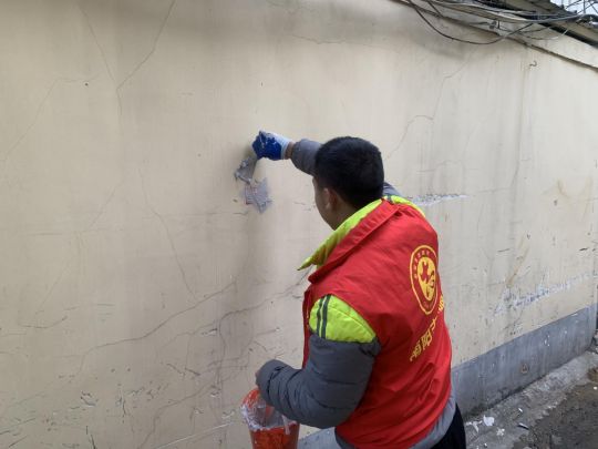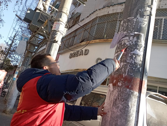 志愿者携带清洁工具,分工明确,沿街而行。采用喷施、铲除、覆盖等方式精细化整饬墙体、电线杆、树干上的涂鸦、广告标语,并沿街扫拾树叶,纸屑,垃圾。对墙体,电线杆,树干上等50余处违规张贴的纸质广告进行铲除。