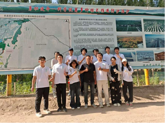 实践团抵达麦盖提县后,在当地提供的专用交通保障下前往塔克拉玛干沙漠边缘观测点。在这里,实践团看到曾经饱受流沙侵蚀、严重威胁周边生产生活空间的区域,经过长期治沙工程的持续推进,如今已构建起多层固沙林带,展现出“林进沙退”的显著成效,让队员们直观感受到治沙工程的伟大力量。