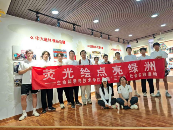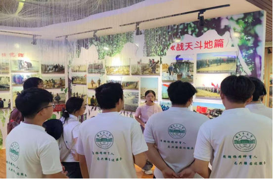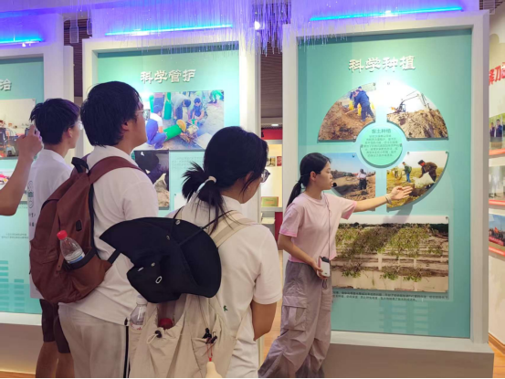 随后,实践团走进麦盖提县生态林展示馆,在防沙治沙中心干部王姣姣的细致讲解下,系统学习当地的治沙技术体系与产业发展模式。在“生态林锁边”“工程治沙”等展区,队员们通过丰富的展板展示,深入了解到治沙人运用网格固沙、飞播造林、节水灌溉等科学手段,实现流沙固定、植被恢复的技术路径,对治沙技术的不断创新与发展表示由衷的赞叹。在梭梭、肉苁蓉等沙生植物培育区,实践团成员们探究了沙生植物从适应沙漠环境的自然育种,经过人工选育、技术赋能,转化为兼具生态固沙功能与经济开发价值资源的全过程,深刻认识到科技在治沙工作中的重要作用。