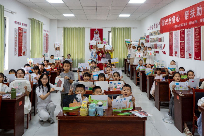 “今天我们来画‘我的家乡’吧!”在实践队队员的引导下,孩子们用彩笔和颜料在画纸上尽情挥洒。翠绿的稻田、金黄的麦穗、蜿蜒的乡间小路……一幅幅充满童趣的作品跃然纸上,既有对自然风光的质朴描绘,也饱含对家乡的深切热爱。团队成员注意到,一名男孩特意用深蓝色蜡笔勾勒出星空下的棉田,他说:“这是爸爸工作的兵团农场,晚上星星特别亮。”