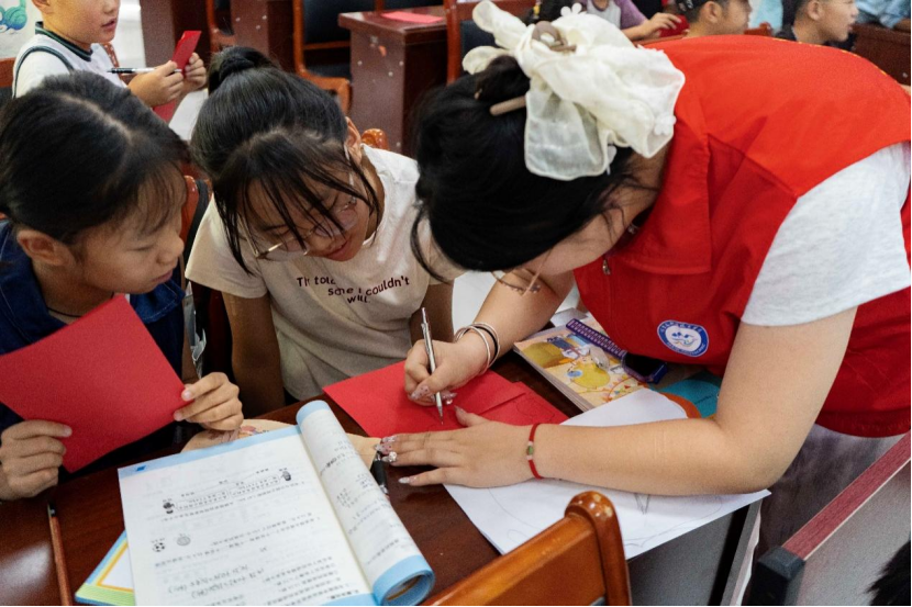 在实践环节,志愿者们为每位小朋友分发了红纸和剪刀。实践队队员们耐心示范“蝴蝶”的剪法:“先对折纸张,画出半边蝴蝶的轮廓,然后沿着线条慢慢剪......”孩子们认真跟随教学步骤,不一会儿,一只只栩栩如生的红蝴蝶就在他们手中“飞”了出来。随后,队员们又指导大家剪制象征“福禄”的葫芦图案,现场气氛热烈欢快。