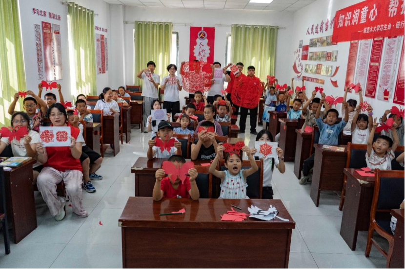 活动最后,孩子们兴奋地展示自己的剪纸作品。实践队队员们组织全体参与者合影留念。社区工作人员汪宇航表示:“这样的活动既有趣又有意义,让孩子们在动手实践中感受到传统文化的魅力。”