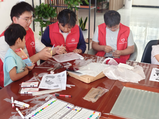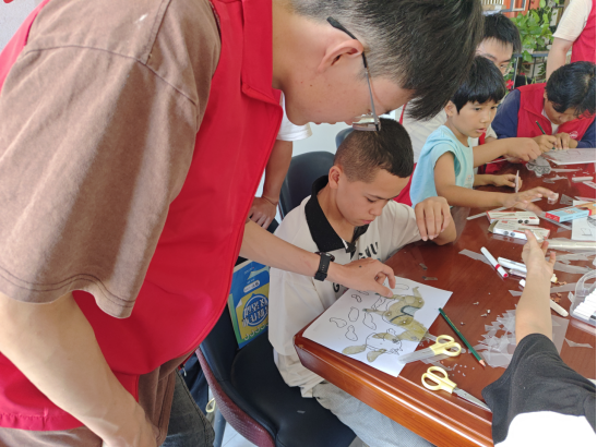 在制作环节,志愿者将传统工艺简化为适合儿童操作的趣味步骤。孩子们手持儿童剪刀,在半透明的仿皮材料上勾勒轮廓,从《西游记》里的孙悟空到《葫芦娃》的爷爷,从憨态可掬的熊猫到威风凛凛的老虎,稚嫩的笔触中藏着天马行空的想象。11岁的张一诺专注地雕刻着“齐天大圣”的金箍棒:“我要让孙悟空的火眼金睛最神气!”上色阶段更是创意迸发,有的孩子用荧光颜料绘制夜间发光的皮影,有的将现代机甲元素融入传统人物造型,传统与创新在色彩碰撞中交融。