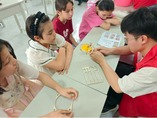 实践制作环节将活动推向高潮。志愿者为每位青少年发放包含摇把、齿轮组、线圈、LED灯泡、导线等材料的工具包,并细致指导组装步骤,孩子们化身“小小工程师”,全身心投入创作:有的低头专注拧紧螺丝,有的互相协作调试线路,遇到齿轮打滑、灯泡不亮等难题时,主动查阅说明书或向志愿者请教。