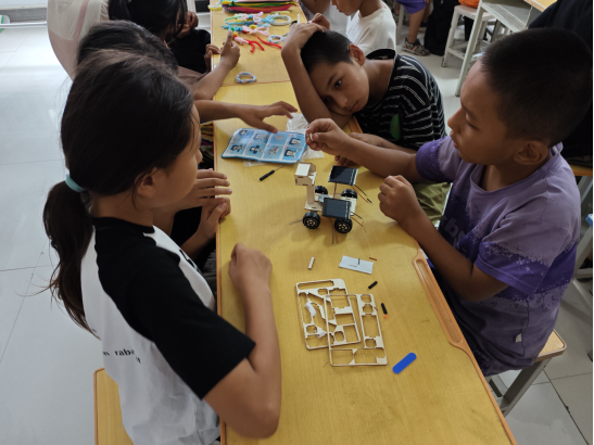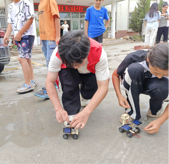 实践环节将活动推向高潮。小朋友们化身“小小发明家”,在志愿者指导下制作光能小车。当太阳能板、马达、车轮等材料分发到手,孩子们立刻投入“创作”:有的独自钻研说明书,小心翼翼地连接电路;有的两两合作,反复调整太阳能板的角度以捕捉最佳光照;遇到线路接触不良的难题时,他们或是向志愿者请教,或是与同伴热烈讨论解决方案。随着第一辆光能小车在阳光下“嗖”地驶出,现场瞬间沸腾——孩子们欢呼着追逐自己的作品,不断变换光照方向观察车速变化,在一次次尝试中深化对光能转化的理解。