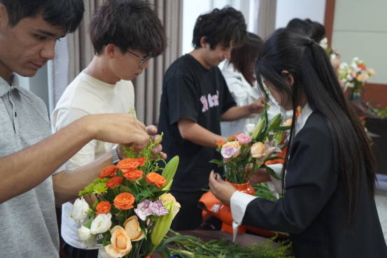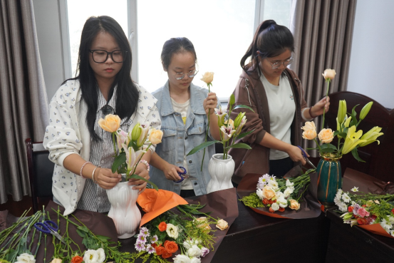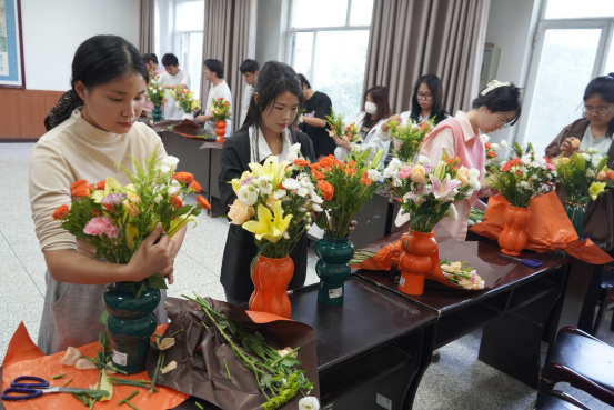 在实践环节,大家纷纷动手,发挥创意,将原本普通的花材变成了一盆盆独具匠心的花艺作品。有的作品清新淡雅,有的作品热烈奔放,每一件都饱含着同学们对美的追求和对生活的热爱。