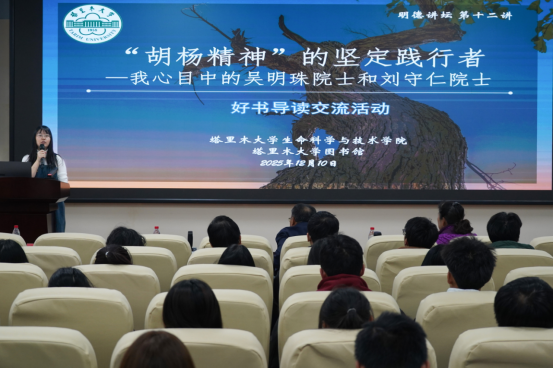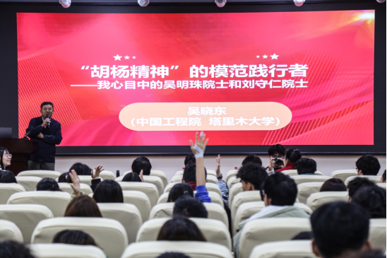导读中,吴晓东教授以生动的语言、翔实的事例,带领现场师生走进吴明珠院士和刘守仁院士的精神世界。他讲到,吴明珠院士60余年扎根新疆,潜心西甜瓜育种研究,忘却世间琐事,唯独铭记瓜田温度,成功培育30多个西甜瓜品种,让甜蜜洒满戈壁;刘守仁院士一生坚守畜牧科研一线,以“让牛羊满山坡”的初心在草原书写科研传奇,两位院士用一生践行“择一事,终一生”的坚守,是胡杨精神的坚定践行者。吴晓东教授的精彩分享,让现场师生真切感受到院士们将平凡事做到极致的伟大,深受启发与触动。