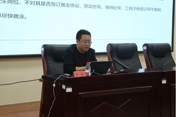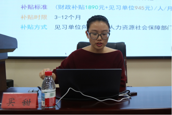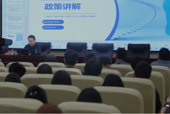 一师人社局就业创业服务科主任买甜作为首位宣讲人,凭借专业且亲和的讲解风格,为大家拉开了政策解读的序幕。她从老员工基层就业政策的出台背景、核心内容等方面入手,以通俗易懂的语言进行阐释。针对同学们关心的基层就业补贴、职业发展路径等问题,让大家对基层就业政策有了初步的认识。