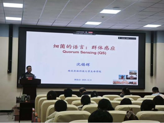 聘任合同签订仪式结束后,沈锡辉教授在塔里木盆地生物资源保护利用重点实验室B302会议室作题为《细菌的语言:群体感应》的学术报告,系统阐述了群体感应及真核生物与原核生物间信号分子的作用机制,永利集团师生参加报告会。