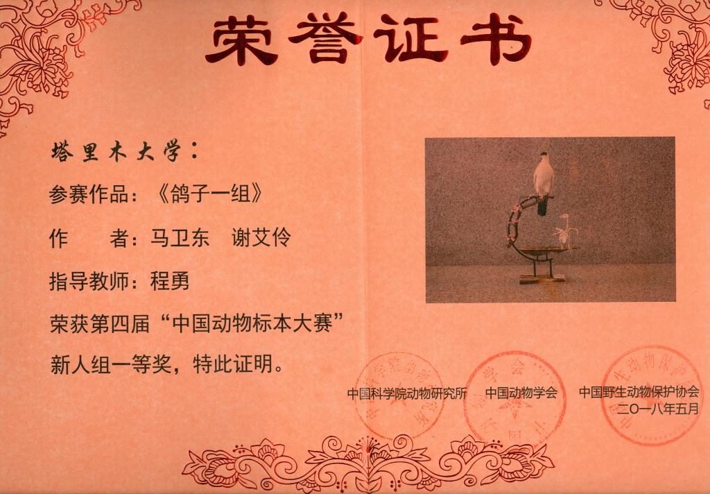 2018年,员工马卫东、谢艾玲制作标本《鸽子一组》获第四届“中国动物标本大赛”新人组一等奖