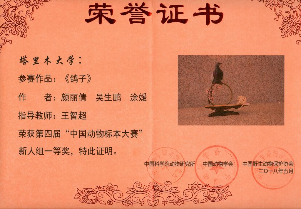 2018年,员工颜丽倩等制作标本《鸽子》获第四届“中国动物标本大赛”新人组一等奖