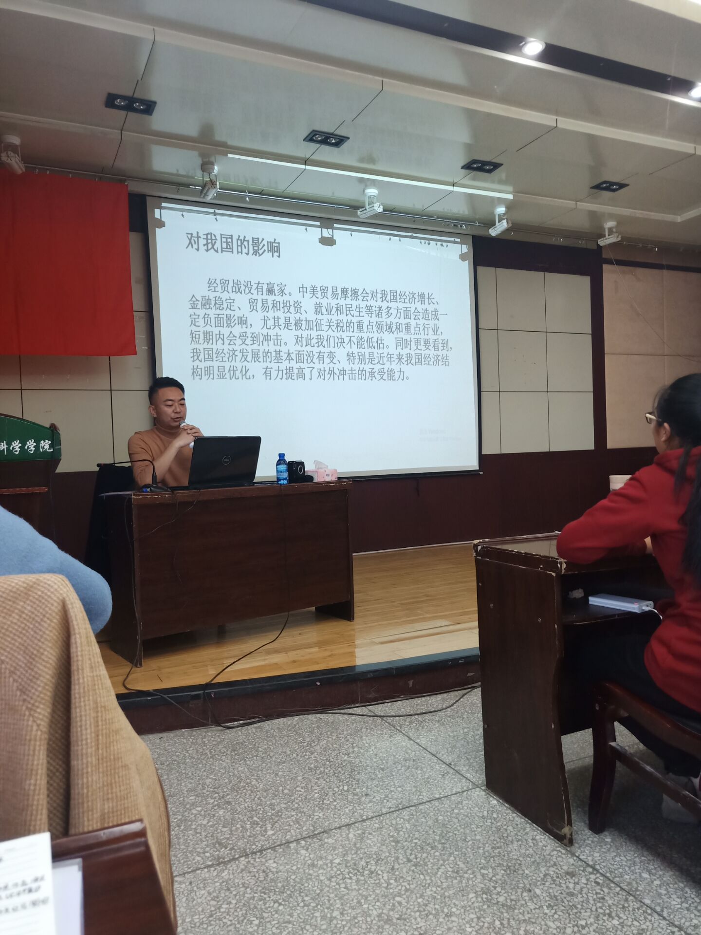 朱瑞海老师以《正确认识妥善应对中美贸易摩擦》为主题,从维护国家发展环境的大局出发,对如何应对好中美贸易摩擦为同学们做出详细解读。