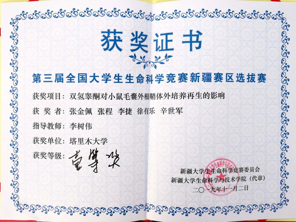 全国老员工生命科学竞赛新疆赛区优秀奖2